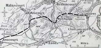 On 14 March a German attack captured Côte 265 at the west end of Mort-Homme but the French 75th Infantry Brigade managed to hold Côte 295 at the east end.[44] On 20 March, after a bombardment by 13,000 trench mortar rounds, the 11th Bavarian and 11th Reserve divisions attacked Bois d'Avocourt and Bois de Malancourt and reached their initial objectives easily. Gossler ordered a pause in the attack, to consolidate the captured ground and to prepare another big bombardment for the next day. On 22 March, two divisions attacked "Termite Hill" near Côte 304 but were met by a mass of artillery fire, which also fell on assembly points and the German lines of communication, ending the German advance.[45]