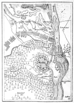 The German forces resumed the offensive on the left front at 3:30 pm. At first, they encountered fierce resistance and were unable to make progress. However, by 5:00 pm they had begun to advance and taken the villages of Unterdöbling and Oberdöbling. Imperial forces were now closing in on the central Ottoman position (the "Türkenschanze", now the Türkenschanzpark),[50] and as they made preparations for a final push, the Polish cavalry began to take action.[31]