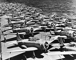 TF–14 consisted of the fleet carrier Saratoga, the fleet oiler Neches, the seaplane tender Tangier (in this case it was outfitted for transport of cargo and people not seaplanes), three heavy cruisers (Astoria, Minneapolis, and San Francisco), and 8 destroyers (Selfridge, Mugford, Jarvis, Patterson, Ralph Talbot, Henley, Blue, and Helm).[50] The convoy carried the 4th Marine Defense Battalion (Battery F, with four 3-inch AA guns, and Battery B, with two 5-inch/51 guns) and fighter squadron VMF-221, equipped with Brewster F2A-3 Buffalo fighters, along with three complete sets of Fire Control equipment for the 3-inch AA batteries already on the island, plus tools and spares; spare parts for the 5-inch coast defense guns and replacement fire control gear; 9,000 5-inch rounds, 12,000 3-inch (76 mm) rounds, and 3 million .50-inch (12.7 mm) rounds; machine gun teams and service and support elements of the 4th Defense Battalion; VMF-221 Detachment (the planes were embarked on Saratoga); as well as an SCR-270 air search radar and an SCR-268 fire control radar for the 3-inch guns, and a large amount of ammunition for mortars and other battalion small arms.