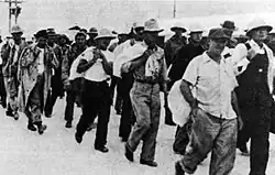 At the end of the battle on 23 December, 1,603 people, of whom 1,150 were civilians, were taken prisoner. Three weeks later, all but roughly 350-360 were taken to Japanese prisoner of war camps in Asia aboard the Nita Maru (later renamed Chūyō). Many of those that stayed were those that were too badly wounded, and some were civilian contractors that knew how to operate the machinery on the island. One source for the prisoner of war experience on Wake was the accounts in the commanding officer logs for Wilcox and Russel.[44] The Nita Maru brought supplies and 500 additional Japanese troops to Wake on 12 January 1942.[45] The POWs were separated; about 20 stayed at the hospital due to injuries; about 367 stayed on Wake due to their construction experience; and over 1,235 were put on the ship.[45] The prisoners on the ship were under the authority of Toshio Saito, and the ship was noted as a "hell ship" for the POWs. Saito encouraged cruel treatment, and the POWs were given too little food and water in unsanitary conditions in the ship's holds, and were systematically beaten and tormented. On 17 January, the ship arrived in Japan, where the POWs were displayed to the Japanese press. On 20 January, it went on a voyage to the prisoner of war camp in Japanese occupied China. Admiral Kajioka had refused a request by an officer to execute some of the POWs, but this officer persisted and went to Saito directly to execute some of them on the voyage. On 22 January, Saito carried out the execution of the Wake POWs.[46] Saito, picked five men at random and ordered them topside. There they were ordered to kneel, and he told them in Japanese: "You have killed many Japanese soldiers in battle. For what you have done you are now going to be killed ... as representatives of American soldiers." The Japanese then beheaded them. The bodies were used for bayonet practice and then thrown overboard.[47]