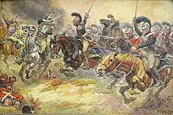 The French army of around 74,500 consisted of 54,014 infantry, 15,830 cavalry, and 8,775 artilleries with 254 guns.[52][53] Napoleon had used conscription to fill the ranks of the French army throughout his rule, but he did not conscript men for the 1815 campaign. His troops were mainly veterans with considerable experience and a fierce devotion to their Emperor.[54] The cavalry in particular was both numerous and formidable, and included fourteen regiments of armoured heavy cavalry, and seven of highly versatile lancers who were armed with lances, sabres and firearms.[55][56][57]