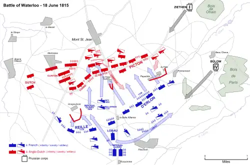 Using the reverse slope, as he had many times previously, Wellington concealed his strength from the French, with the exception of his skirmishers and artillery.[76] The length of front of the battlefield was also relatively short at 2.5 miles (4 km). This allowed Wellington to draw up his forces in depth, which he did in the centre and on the right, all the way towards the village of Braine-l'Alleud, in the expectation that the Prussians would reinforce his left during the day.[77]