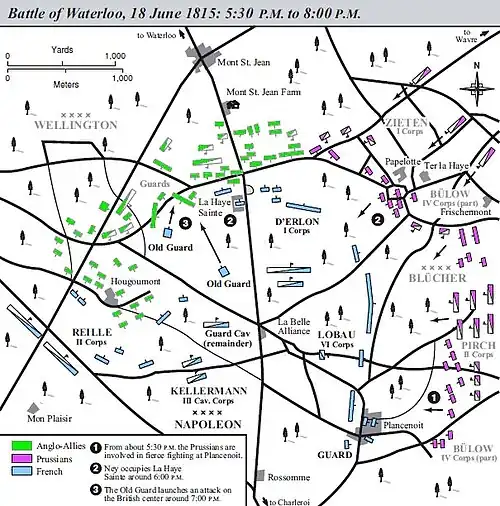Upon learning that the Prussian Army was able to support him, Wellington decided to offer battle on the Mont-Saint-Jean[19] escarpment across the Brussels Road, near the village of Waterloo. Here he withstood repeated attacks by the French throughout the afternoon of 18 June,[20] and was eventually aided by the progressively arriving 50,000 Prussians who attacked the French flank and inflicted heavy casualties. In the evening, Napoleon assaulted the Anglo-allied line with his last reserves, the senior infantry battalions of the Imperial Guard. With the Prussians breaking through on the French right flank, the Anglo-allied army repulsed the Imperial Guard, and the French army was routed.