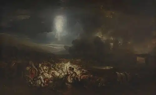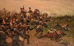 The French were forced to march through rain and black coal-dust mud to reach Waterloo, and then to contend with mud and rain as they slept in the open.[60] Little food was available, but nevertheless the veteran soldiers were fiercely loyal to Napoleon.[58][61]
