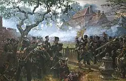 The initial attack by Pierre François Bauduin's brigade emptied the wood and park, but was driven back by heavy British artillery fire, and cost Bauduin his life. As the British guns were distracted by a duel with French artillery, a second attack by Soye's brigade and what had been Bauduin's succeeded in reaching the north gate of the house. Sous-Lieutenant Legros, a French officer, broke the gate open with an axe, and some French troops managed to enter the courtyard.[97] The Coldstream Guards and the Scots Guards arrived to support the defence. There was a fierce melee, and the British managed to close the gate on the French troops streaming in. The Frenchmen trapped in the courtyard were all killed.