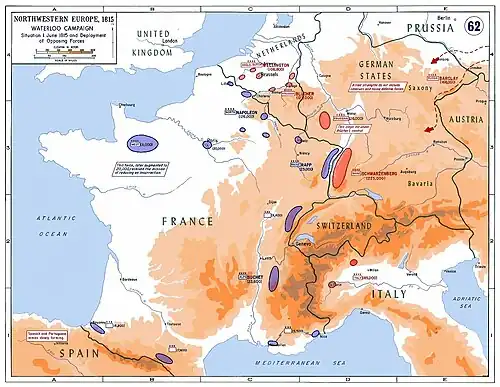 On 13 March 1815, six days before Napoleon I reached Paris, the powers at the Congress of Vienna declared him an outlaw.[24] Four days later, the United Kingdom, Russia, Austria, and Prussia mobilised armies to defeat Napoleon.[25] Critically outnumbered, Napoleon knew that once his attempts at dissuading one or more members of the Seventh Coalition from invading France had failed, his only chance of remaining in power was to attack before the coalition mobilised.[26]
