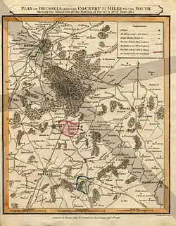 With the Prussian retreat from Ligny, Wellington's position at Quatre Bras was untenable. The next day he withdrew northwards, to a defensive position that he had reconnoitred the previous year—the low ridge of Mont-Saint-Jean, south of the village of Waterloo and the Sonian Forest.[45]
