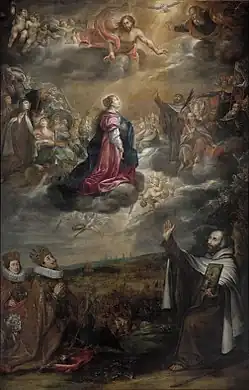 Painting celebrating the Catholic victory, by Anton Stevens (c. 1610–1675). In the upper part there is Our Lady of Victory surrounded by saints; in the lower left-hand corner there is the victorious Emperor Ferdinand II with his son Ferdinand III and the Bohemian lion.