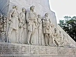 In the initial moments of the assault, Mexican troops were at a disadvantage. Their column formation allowed only the front rows of soldiers to fire safely.[107] Unaware of the dangers, the untrained recruits in the ranks "blindly fir[ed] their guns", injuring or killing the troops in front of them.[108] The tight concentration of troops also offered an excellent target for the Texian artillery.[107] Lacking canister shot, Texians filled their cannon with any metal they could find, including door hinges, nails, and chopped-up horseshoes, essentially turning the cannon into giant shotguns.[104] According to the diary of José Enrique de la Peña, "a single cannon volley did away with half the company of chasseurs from Toluca".[109] Duque fell from his horse after sustaining a wound in his thigh and was almost trampled by his own men. General Manuel Castrillón quickly assumed command of Duque's column.[26]