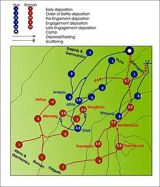 Jordanes' description of the battle, according to Hughes, takes place from the Roman perspective. Attila's forces arrived on the ridge first, on the far right side, before the Visigoths could take that position. Then Aetius' Romans arrived on the left side of the ridge, and repulsed the Gepids as they came up. Finally the Alans and the Visigoths under Thorismund fought their way up and secured the centre of the ridge, holding it against Attila.[93] However, Hughes differs from mainstream explanations in that he places Thorismund between the Alans and Visigothic main body, rather than on the Visigothic flank. MacDowall, for example, places Thorismund on the far right of the battlefield.[94] The final phase of the battle is characterised by the Gothic attempt to take the right side of the ridge, in which Theodoric is slain, with the rest of his army unaware of his death. It is at this point that Thorismund located Attila's position in the Hunnic battle line, and attacked the Hunnic centre, nearly slaying Attila himself and forcing the Hunnic centre to retreat. Both armies fell into confusion as darkness descended, and neither side knew the outcome of the battle until the following morning.[95]