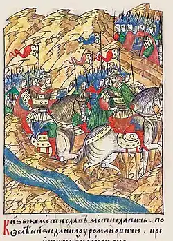 The Venetians sent a delegation to the Mongols, and they concluded an alliance in which it was agreed that the Mongols would destroy any other European trading post they came across.[27] As the Mongols pursued the Cumans, Jebe sent a detachment to Crimea, where the Republic of Genoa had trading stations. The Mongols captured and plundered the Genoese city of Soldaia. Meanwhile, Koten fled to the court of his son-in-law, Mstislav Mstislavich of Galicia.[26] He warned Mstislav: "Today the Mongols have taken our land and tomorrow they will take yours".[28] However, the Cumans were ignored for almost a year as the Rus had suffered from Cuman raids for decades. But when news reached Kiev that the Mongols were marching along the Dniester River, the Rus responded.[29] Mstislav gathered an alliance of the Kievan Rus' princes including Mstislav III of Kiev and Prince Yuri II of Vladimir-Suzdal, who promised support. The Rus princes then began mustering their armies and going towards the rendezvous point.[25]