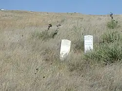 Custer's body was found with two gunshot wounds, one to his left chest and the other to his left temple. Either wound would have been fatal, though he appeared to have bled from only the chest wound; some scholars believe his head wound may have been delivered postmortem. Some Lakota oral histories assert that Custer, having sustained a wound, committed suicide to avoid capture and subsequent torture. This would be inconsistent with his known right-handedness, but that does not rule out assisted suicide (other native accounts note several soldiers committing suicide near the end of the battle).[72] Custer's body was found near the top of Custer Hill, which also came to be known as "Last Stand Hill". There the United States erected a tall memorial obelisk inscribed with the names of the 7th Cavalry's casualties.[71]