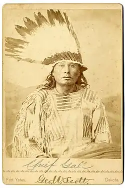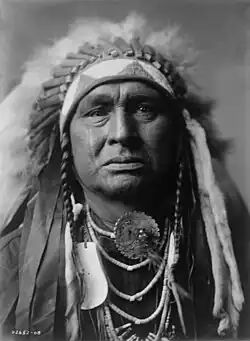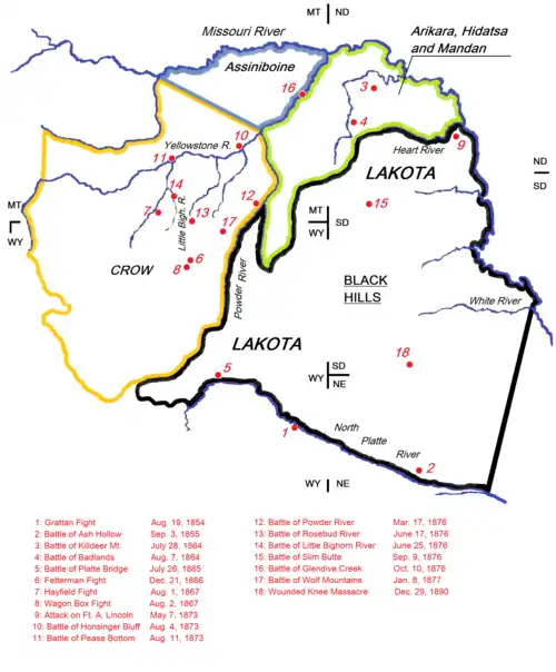 Most battles in the Great Sioux War, including the Battle of the Little Bighorn, were on lands those natives had taken from other tribes since 1851.[4][5][6][7] The Lakotas were there without consent from the local Crow tribe, which had a treaty claim on the area. Already in 1873, Crow chief Blackfoot had called for U.S. military actions against the native intruders.[8][9] The steady Lakota incursions into treaty areas belonging to the smaller tribes were a direct result of their displacement by the United States in and around Fort Laramie, as well as in reaction to white encroachment into the Black Hills, which the Lakota consider sacred.[10] This pre-existing Indian conflict provided a useful wedge for colonization and ensured the United States a firm Indian alliance with the Arikaras[11] and the Crows during the Lakota Wars.[12][13][14]