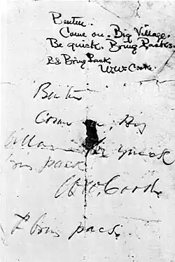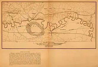Atop the bluffs near what is known today as Reno Hill, Reno's depleted and shaken troops were joined by Captain Benteen's column while Reno's men were still retreating up from the valley.[67] (Companies D, H, and K), arriving from the south. This force had been returning from a lateral scouting mission when it had been summoned by Custer's messenger, Italian immigrant bugler John Martin (Giovanni Martino) with the handwritten message: "Benteen. Come on, Big Village, Be quick, Bring packs. P.S. Bring Packs."[47] This message made no sense to Benteen, as his men would be needed more in a fight than the packs carried by herd animals.[67] Though both men inferred that Custer was engaged in battle, Reno refused to move until the packs arrived so his men could resupply.[67] The detachments were later reinforced by McDougall's Company B and the pack train. The 14 officers and 340 troopers on the bluffs organized an all-around defense and dug rifle pits using whatever implements they had among them, including knives. This practice had become standard during the last year of the American Civil War, as Union and Confederate troops used knives, eating utensils, mess plates, and pans to dig effective battlefield fortifications.[68]