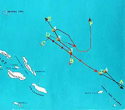 Map of the Battle of the Santa Cruz Islands, 26 October 1942. Red lines are Japanese warship forces and black lines are US carrier forces. Numbered yellow dots represent significant actions in the battle.