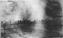 The crew of Shōkaku fights fires on the flight deck after the US attack