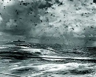 Chikuma under attack on 26 October. Smoke emerges from the center of the ship where a 1,000 lb (450 kg) bomb hit directly on the bridge