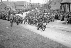 Despite the fact that the Canadians could not afford heavy losses, the 3rd Division began a period of "intense combat" to clear out the Breskens Pocket.[59] The Régiment de la Chaudière attacked the town of Oostburg on 24 October, losing an entire company, but since they had been ordered to take Oostburg at "any price", the "Chads" dug in to hold their ground while the Queen's Own Rifles came to their aid.[59] On 25 October, the Queen's Own Rifles took Oostburg after what its war diary called "a wild bayonet charge" amid "fairly heavy" casualties.[59] Lieutenant Boos of A Company of the Queen's Own Rifles was awarded the Military Cross for leading what should have been a suicidal bayonet charge on the Oostburg town gates but ended with him and his men taking the gates.[59] Despite tenacious German opposition, inspired at least in part by Eberding's policy of executing soldiers who retreated without orders, the Canadians pushed the Germans back steadily.[60] In the last days of the battle, German morale declined and the number of executions of "deserters" increased as many German soldiers wished to surrender rather than die in what was clearly a lost battle.[60] The Régiment de la Chaudière, which could ill-afford the losses, seized a bridgehead on the Afleidingskanaal van de Lije (Derivation Canal of the Lys), over which the engineers built a bridge.[60]