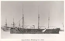 In March 1858, the French took development of the ironclad to its next logical step: a proper, ocean-going armored warship. This vessel, another design by Dupuy de Lome, was Gloire, and after her launching in 1859, Napoleon III ordered another five similar ships, which sparked a naval arms race with Britain. The first French ironclads had the profile of a ship of the line, cut to one deck due to weight considerations. Although made of wood and reliant on sail for most journeys, Gloire and her contemporaries were fitted with screw propellers, and their wooden hulls were protected by a layer of thick iron armor. Britain responded promptly with Warrior, a similar but much larger ironclad with an iron hull. By the time Warrior was completed in 1861, another nine ironclads were under construction in British shipyards, some of which were conversions of screw ships of the line that were already being built.[17][18]