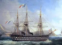 A ship of the line was a large, unarmored wooden sailing ship which mounted a battery of up to 120 smoothbore guns and carronades, which came to prominence with the adoption of line of battle tactics in the early 17th century. From 1794, the alternative term 'line of battle ship' was contracted to 'battle ship' or 'battleship'. The sheer number of guns fired broadside meant a ship of the line could wreck any wooden enemy, holing her hull, knocking down masts, wrecking her rigging, and killing her crew. They also imparted a psychological effect on the crews of smaller vessels. Ships of the line were also fairly resilient to the guns of the day; for example, the British Royal Navy lost no first-rate (the largest type of ship of the line) to enemy action during the entire 18th century.[1] Over time, ships of the line gradually became larger and carried more guns, but otherwise remained quite similar. Development of the first-rates was particularly conservative, as these ships represented a major investment. By the early 1800s, the traditional "seventy-four" (so-named because it carried 74 guns) was no longer considered to be a proper ship of the line, having been supplanted by 84- and 120-gun ships.[2][3]