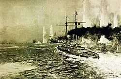 In contrast, dreadnoughts proved to be much more resilient to underwater attack. HMS Marlborough was damaged by a torpedo at Jutland, but nevertheless returned to port.[77] The German SMS Westfalen was torpedoed at the action of 19 August 1916,[78] and SMS Grosser Kurfürst and Kronprinz were torpedoed by the same submarine in November 1917; all three survived.[79] SMS Bayern was mined during Operation Albion and remained in action against Russian artillery batteries for some time thereafter.[80] Dreadnoughts lost to underwater attack were rare. HMS Audacious was sunk by a mine in October 1914,[81] the Austro-Hungarian SMS Szent Istvan was sunk by Italian MAS boats in June 1918, and five months later, Italian frogmen sank Viribus Unitis using a powerful limpet mine.[82]