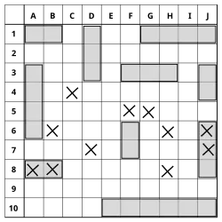 The game is played on four grids, two for each player. The grids are typically square, usually 10×10, and the individual squares in the grid are identified by letter and number.[12] On one grid the player arranges ships and records the shots by the opponent. On the other grid, the player records their own shots.