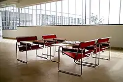 Weimar was in the German state of Thuringia, and the Bauhaus school received state support from the Social Democrat-controlled Thuringian state government. The school in Weimar experienced political pressure from conservative circles in Thuringian politics, increasingly so after 1923 as political tension rose. One condition placed on the Bauhaus in this new political environment was the exhibition of work undertaken at the school. This condition was met in 1923 with the Bauhaus' exhibition of the experimental Haus am Horn.[22] The Ministry of Education placed the staff on six-month contracts and cut the school's funding in half. The Bauhaus issued a press release on 26 December 1924, setting the closure of the school for the end of March 1925.[23][24] At this point it had already been looking for alternative sources of funding. After the Bauhaus moved to Dessau, a school of industrial design with teachers and staff less antagonistic to the conservative political regime remained in Weimar. This school was eventually known as the Technical University of Architecture and Civil Engineering, and in 1996 changed its name to Bauhaus-University Weimar.