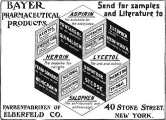 Heroin (diacetylmorphine), now illegal as an addictive drug, was introduced as a non-addictive substitute for morphine,[32] and trademarked and marketed by Bayer from 1898 to 1910 as a cough suppressant and over-the-counter treatment for other common ailments, including pneumonia and tuberculosis.[33] While Bayer scientists were not the first to make heroin, the company did lead the way in commercializing it.[34] Heroin was a Bayer trademark until after World War I.[35] Bayer's director of pharmacology did not want the drug to have "too complicated a name" so Bayer settled on heroisch, the German word for heroic.[36]
