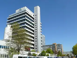A further expansion in Elberfeld was impossible, so the company moved to the village Wiesdorf at Rhein and settled in the area of the alizarin producer Leverkus and Sons. A new city, Leverkusen, was founded there in 1930 and became home to Bayer AG's headquarters. The company's corporate logo, the Bayer cross, was introduced in 1904, consisting of the word BAYER written vertically and horizontally, sharing the Y and enclosed in a circle.[21] An illuminated version of the logo is a landmark in Leverkusen.[22]
