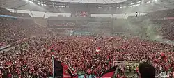 Founded in 1904 by employees of the paint factory, today better known as a pharmaceutical company Bayer (whose headquarters are in Leverkusen and from which the club draws its name), the club was formerly a department of TSV Bayer 04 Leverkusen sports club whose members participate in athletics, gymnastics, basketball, field and handball. In 1999, the football department was separated from the sports club.[8] Bayer Leverkusen's main colours are red and black, which feature across their playing kits and badge, and their main rival is 1. FC Köln,[9] while the fans have a deep friendship with the supporters of Kickers Offenbach for almost 50 years.[10]