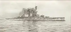 Following the armistice with Germany in November 1918, the majority of the High Seas Fleet was to be interned in the British naval base at Scapa Flow.[40] Bayern was listed as one of the ships to be handed over, though Baden initially was not. The battlecruiser Mackensen, which the British believed to be completed, was requested instead. When it became apparent to the Allies that Mackensen was still under construction, Baden was ordered to replace it.[41] On 21 November 1918, the ships to be interned, under the command of Rear Admiral Ludwig von Reuter, sailed from their base in Germany for the last time. The fleet rendezvoused with the light cruiser HMS Cardiff, before meeting a massive flotilla of some 370 British, American, and French warships for the voyage to Scapa Flow.[42] Baden arrived at Scapa Flow separately on 14 December 1918.[43]