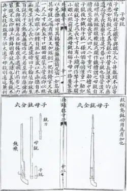 The first recorded instance of a bayonet proper is found in the Chinese military treatise, Binglu published in 1606. It was in the form of the Son-and-mother gun, a breech-loading musket that was issued with a roughly 57.6 cm (22.7 in) long plug bayonet, giving it an overall length of 1.92 m (6 ft 4 in) with the bayonet attached. It was labelled as a "gun-knife" (simplified Chinese: 铳刀; traditional Chinese: 銃刀; pinyin: Chòngdāo) with it being described as a "short sword that can be inserted into the barrel and secured by twisting it slightly" that it is to be used "when the battle have depleted both gunpowder and bullets as well as fighting against bandits, when forces are closing into melee or encountering an ambush" and if one "cannot load the gun within the time it takes to cover two bu (3.2 meters) of ground they are to attach the bayonet and hold it like a spear".[5][6]