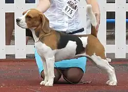 The general appearance of the Beagle resembles a miniature Foxhound, but the head is broader and the muzzle shorter, the expression completely different and the legs shorter in proportion to the body.[24] They are generally between 33 and 40 centimetres (13 and 16 in) high at the withers and weigh between 18 and 35 lb (8.2 and 15.9 kg), with females being slightly smaller than males on average.[25] They have a smooth, somewhat domed skull with a medium-length, square-cut muzzle, and a black (or occasionally liver) gumdrop nose. The jaw is strong, and the teeth scissor together with the upper teeth fitting perfectly over the lower teeth. Both sets align square to the jaw. The eyes are large, hazel or brown, with a mild, hound-like pleading look. The large ears are long, soft, and low-set, turning towards the cheeks slightly and rounded at the tips. Beagles have a strong, medium-length neck (which is long enough for them to easily bend to the ground to pick up a scent), with little folding in the skin but some evidence of a dewlap; a broad chest narrowing to a tapered abdomen and waist and a long, slightly curved tail (known as the "stern") tipped with white. The white tip, known as the flag, was bred for selectively, as the tail remains easily seen when the dog's head is down following a scent.[26] The tail does not curl over the back, but is held upright when the dog is active. The Beagle has a muscular body and a medium-length, smooth, hard coat. The front legs are straight and carried under the body while the rear legs are muscular and well bent at the stifles.[27]