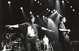 Check Your Head was recorded in the band's G-Son studio in Atwater Village, California, and released on its Grand Royal record label.[36] The band was influenced to play instruments on this album by Dutch group Urban Dance Squad; with Mike D on drums, Yauch on bass, Horovitz on guitar and Mark Ramos Nishita ("Keyboard Money Mark") on keyboards. Mario Caldato, Jr., who had helped in the production of Paul's Boutique, engineered the record and became a longtime collaborator. Check Your Head was released in 1992 and was certified double Platinum in the US and peaked at number 10 on the Billboard 200.[32] The single "So What'cha Want" reached number 93 on the Billboard Hot 100[37] and charted on both the Rap and Modern Rock Chart,[38] while the album's first single, "Pass the Mic", peaked at number 38 on the Hot Dance Music chart.[38] The album also introduced a more experimental direction, with funk and jazz inspired songs including "Lighten Up" and "Something's Got to Give". The band returned to their hardcore punk roots for the song "Time for Livin'", a cover of a 1974 Sly and the Family Stone song. The addition of instruments and the harder rock sound of the album could be considered a precursor to the nu metal genre of music to come out in the later half of the 1990s.[36][39][40]