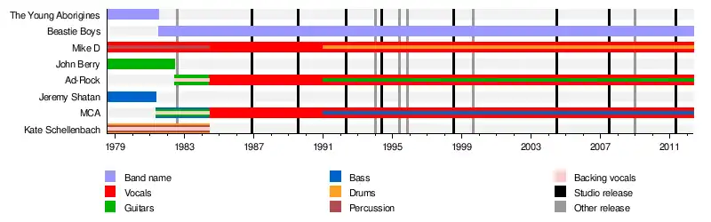 The Beastie Boys were an American hip-hop group formed in New York City in 1981.[1] They were composed of Adam "Ad-Rock" Horovitz (vocals, guitar), Adam "MCA" Yauch (vocals, bass), and Michael "Mike D" Diamond (vocals, drums). The Beastie Boys were formed out of members of experimental hardcore punk band the Young Aborigines, which was formed in 1979, with Diamond on drums, Jeremy Shatan on bass guitar, John Berry on guitar, and Kate Schellenbach later joining on percussion.[2] When Shatan left New York City in mid-1981, Yauch replaced him on bass and the resulting band was named the Beastie Boys. Berry left shortly thereafter and was replaced by Horovitz.