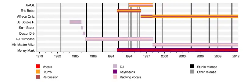 The Beastie Boys have sold 20 million records in the United States and had seven platinum-selling albums from 1986 to 2004.[4] They are the biggest-selling rap group since Billboard began recording sales in 1991.[5] In 2012, they became the third rap group to be inducted into the Rock and Roll Hall of Fame. In the same year, Yauch died of cancer and the Beastie Boys disbanded.[6] The remaining members have released several retrospective works, including a book, a documentary, and a career-spanning compilation album.