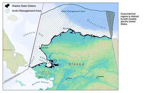 Canada maintains that this treaty is extensible from the land into the Beaufort Sea along the meridian. The United States rejects this extension and instead asserts a boundary line based upon equidistance, although its position is somewhat undermined by its acceptance in 1867 of similar treaty wording and a similar interpretation under the treaty whereby it acquired Alaska.[17] Both the U.S. and Canada agree that they are bound by the 1958 Convention on the Continental Shelf; and they both agree that the boundary should be "equitable", as determined by the International Court of Justice. They differ on what should be deemed "equitable". The U.S. contends that "equidistance is an appropriate principle for determining a maritime boundary where there are no special circumstances in the area and when equidistance results in a boundary in accordance with equitable principles". Canada contends that an equidistance principle does not result in an equitable boundary, because distortion would occur. The coast of Yukon is concave, whereas the coast of Alaska is convex; and thus an equidistance principle would result in a significant extension of the U.S. possession.[20] This dispute has taken on increased significance due to the possible presence of natural reserves within the wedge,[17][21][22] which according to Canada's National Energy Board may contain 1.7 billion cubic metres (60 billion cubic feet) of gas, which would cover the national consumption for 20 years, and more than 1 billion cubic metres (6.3 billion barrels) of oil.[19] Because of this, Canada argues that "special circumstances" apply to this border, a position that the U.S. rejects.[20] This dispute is in this respect a mirror image of the dispute between the U.S. and Canada over the Gulf of Maine, where the U.S. argued for "special circumstances" and Canada argued for the equidistance principle.[20] (In that latter dispute, both of those arguments were rejected, and the border was drawn based upon geometric principles taking into account geographic factors.[20]) Neither the U.S. nor Canada has pressed for a swift resolution for the matter, or arbitration at the International Court of Justice, however;[17] and the two have in the meantime cooperated in several measures aimed at preserving the maritime environment.[17][20]