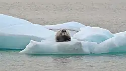The food chain of the Beaufort Sea is relatively simple: It starts with phytoplankton and epontic algae (single-cell algae associated with the lower interface of sea ice[49]), which provide energy to zooplankton, and epontic and coastal amphipods. The latter serve as a food for seabirds and fish, primarily as polar cod and Arctic char. Polar cod is a major food of Arctic char, beluga, narwhal, seabirds and seals, which are dominated by the bearded seal and ringed seal. Bearded seal and walrus also feed on benthic invertebrates. On top of the food pyramid stands the polar bear, which feeds primarily on seals, but also on any large marine mammals when it has a chance, such as carcasses and whales trapped in ice fields.[50]