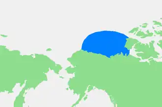 The eastern part of the Beaufort sea is a major habitat of beluga whales (Delphinapterus leucas) with an estimated population of 39,000.[39][40] This population is stable and might even be increasing; it does not appear to be affected by the offshore oil exploration in the area.[40] The Eastern Beaufort stock of belugas spends summer in the Mackenzie Estuary, Viscount Melville Sound, Amudsen Gulf, and beyond.[41][42] Whales tend to occupy the Mackenzie Estuary only intermittently and for a few days at a time, spending much of their time offshore near or beyond the shelf break and in the polar pack ice.[42] In winter, they migrate long distances to the Bering Sea.[43] Genetic analyses have confirmed that belugas of the Beaufort Sea are clearly distinct from those of other Canadian and Alaskan waters, despite often sharing a common wintering habitat.[43][44]