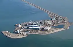The Beaufort Sea contains major gas and petroleum reserves beneath the seabed, a continuation of proven reserves in the nearby Mackenzie River and North Slope.[23] The Beaufort Sea was first explored for sub-shelf hydrocarbons in the 1950s and estimated to contain about 250 km3 (60 cu mi) of oil and 300,000 km3 (72,000 cu mi) of natural gas under its coastal shelf. Offshore drilling began in 1972; about 70 wells were set up by the 1980s[54] and 200 wells by 2000.[55] These activities resulted in dredging of about 46.5 million m3 of sea bottom soil, as well as discharge of drilling muds which contained barite, clay, caustic soda, and heavy metals zinc, copper, lead, chromium, cobalt, nickel, cadmium and mercury. About 50,400 m3 (1,780,000 cu ft) of oil was produced in 1986.[54]