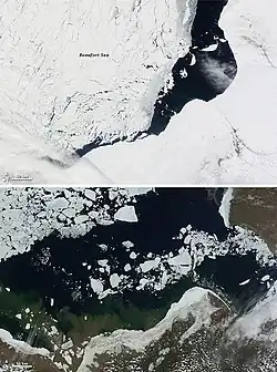 The Beaufort Sea is frozen over through the year, except for August and September when the ice breaks near the coast and opens what was once a 50–100 km (31–62 mi) wide strip of open water.[2] During the 2000s, due to climate change in the Arctic, the ice-free area in late summer greatly enlarged. During the record minimum extent of Arctic sea ice in September, 2012, the sea ice boundary had retreated northward much farther than normal from the coast.[30][31][32][33]