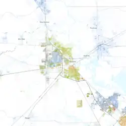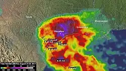 Hurricane Rita in 2005 and Hurricane Ike in 2008 both caused significant damage.[43][44] Both Hurricane Harvey in 2017 and Tropical Storm Imelda in 2019 caused historic flooding throughout the city.[45] Hurricane Laura in 2020 posed a significant threat to the town,[46] as it was forecasted to make landfall at the border of Texas and Louisiana, almost following the same track as Hurricane Rita in 2005. The storm turned more northerly close to landfall, and spared Beaumont the worst impacts and damage. Minor damage was reported with winds gusting around hurricane-force for a short period of time as Laura moved over Lake Charles, Louisiana. Also, Hurricane Delta in 2020 passed near the region as it made landfall in Southwest Louisiana.[47] Impacts were about the same with Delta as they were with Laura.