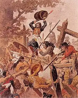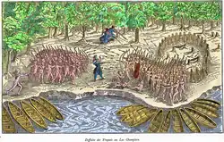 In 1610, Champlain and his French companions helped the Algonquins and the Wendat defeat a large Iroquois raiding party. In 1615, he joined a Wendat raiding party and took part in a siege on an Iroquois town, probably among the Onondaga south of Lake Ontario in New York. The attack ultimately failed, and Champlain was injured.[11]