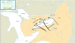 The French decided to become directly involved in the conflict. The Wendat and the Iroquois had an estimated 25,000 to 30,000 members each.[16] The Wendat and Susquehannocks formed an alliance to counter Iroquois aggression in 1647, and their warriors greatly outnumbered those of the Iroquois. The Wendat tried to break the Iroquois Confederacy by negotiating a separate peace with the Onondaga and Cayuga tribes, but the other tribes intercepted their messengers and ended the negotiations. During the summer of 1647, there were several small skirmishes between the tribes, but a more significant battle occurred in 1648 when the two Algonquin tribes passed a fur convoy through an Iroquois blockade. They succeeded and inflicted high casualties on the Iroquois.[17] In the early 1650s, the Iroquois began attacking the French themselves, although some of the Iroquois tribes had peaceful relations with them, notably the Oneida and Onondaga tribes. They were under control of the Mohawks, however, who were the strongest tribe in the Confederation and had animosity towards the French presence. After a failed peace treaty negotiated by Chief Canaqueese, Iroquois moved north into New France along Lake Champlain and the Richelieu River, attacking and blockading Montreal. By 1650, they controlled the area from the Virginia Colony in the south up to the St. Lawrence. In the west, the Iroquois had driven the Algonquin-speaking Shawnee out of the Ohio Country and seized control of the Illinois Country as far west as the Mississippi River. In January 1666, the French invaded the Iroquois and took Chief Canaqueese prisoner. In September, they proceeded down the Richelieu but were unable to find an Iroquois army, so they burned their crops and homes. Many Iroquois died from starvation in the following winter. During the following years, the Iroquois strengthened their confederacy to work more closely and create an effective central leadership, and the five tribes ceased fighting among themselves by the 1660s. They also easily coordinated military and economic plans, and they increased their power as a result.[18]