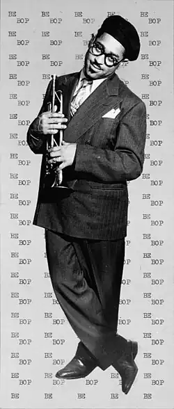 Some researchers speculate that it was a term used by Charlie Christian because it sounded like something he hummed along with his playing.[12] Dizzy Gillespie stated that the audiences coined the name after hearing him scat the then-nameless compositions to his players and the press ultimately picked it up, using it as an official term: "People, when they'd wanna ask for those numbers and didn't know the name, would ask for bebop."[13] Another theory is that it derives from the cry of "Arriba! Arriba!" used by Latin American bandleaders of the period to encourage their bands.[14] At times, the terms "bebop" and "rebop" were used interchangeably. (Although rebop differed from bebop with its more impressionist use of discordant chords.) By 1945, the use of "bebop"/"rebop" as nonsense syllables was widespread in R&B music, for instance Lionel Hampton's "Hey! Ba-Ba-Re-Bop". The bebop musician or bopper became a stock character in jokes of the 1950s, overlapping with the beatnik.[15]