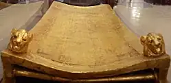 The Egyptians had high bedsteads which were ascended by steps, with bolsters or pillows, and curtains to hang around.[15] The elite of Egyptian society such as its pharaohs and queens even had beds made of wood, sometimes gilded. Often there was a head-rest as well, semi-cylindrical and made of stone, wood, or metal.[16] Ancient Assyrians, Medes, and Persians had beds of a similar kind, and frequently decorated their furniture with inlays or appliques of metal, mother-of-pearl, and ivory.
