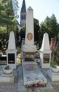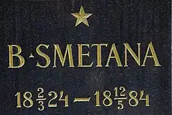 Smetana's funeral took place on 15 May, at the Týn Church in Prague's Old Town. The subsequent procession to the Vyšehrad Cemetery was led by members of the Hlahol, bearing torches, and was followed by a large crowd.[100] The grave later became a place of pilgrimage for musical visitors to Prague.[103] On the funeral evening, a scheduled performance of The Bartered Bride at the National Theatre was allowed to proceed, the stage draped with black cloth as a mark of respect.[100]