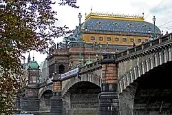 The long-delayed premiere of Smetana's opera Libuše finally arrived when the National Theatre opened on 11 June 1881. He had not initially been given tickets, but at the last minute was asked into the theatre director's box. The audience received the work enthusiastically, and Smetana was called to the stage repeatedly.[94][95] Shortly after this event the new theatre was destroyed by fire; despite his infirmities, Smetana helped to raise funds for the rebuilding.[93][96] The restored theatre reopened on 18 November 1883, again with Libuše.[93]