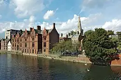 The name of the town is believed to derive from the name of a Saxon chief called Beda,[3] and a ford crossing the River Great Ouse. Bedford was a market town for the surrounding agricultural region from the early Middle Ages. The Anglo-Saxon King Offa of Mercia was buried in the town in 796;[4] this is believed to be in his new minster, now the Church of St Paul,[5] or on the banks of the Great Ouse where his tomb was soon lost to the river.[6] In 886 it became a boundary town separating Wessex and Danelaw.[7][8] It was the seat of the Barony of Bedford. In 919 Edward the Elder built the town's first known fortress, on the south side of the River Great Ouse and there received the area's submission. This fortress was destroyed by the Danes. William II gave the barony of Bedford to Paine de Beauchamp, who built a new, strong castle.