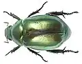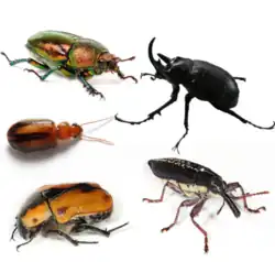 The very large number of beetle species poses special problems for classification. Some families contain tens of thousands of species, and need to be divided into subfamilies and tribes. Polyphaga is the largest suborder, containing more than 300,000 described species in more than 170 families, including rove beetles (Staphylinidae), scarab beetles (Scarabaeidae), blister beetles (Meloidae), stag beetles (Lucanidae) and true weevils (Curculionidae).[10][47] These polyphagan beetle groups can be identified by the presence of cervical sclerites (hardened parts of the head used as points of attachment for muscles) absent in the other suborders.[48] Adephaga contains about 10 families of largely predatory beetles, includes ground beetles (Carabidae), water beetles (Dytiscidae) and whirligig beetles (Gyrinidae). In these insects, the testes are tubular and the first abdominal sternum (a plate of the exoskeleton) is divided by the hind coxae (the basal joints of the beetle's legs).[49] Archostemata contains four families of mainly wood-eating beetles, including reticulated beetles (Cupedidae) and the telephone-pole beetle.[50] The Archostemata have an exposed plate called the metatrochantin in front of the basal segment or coxa of the hind leg.[51] Myxophaga contains about 65 described species in four families, mostly very small, including Hydroscaphidae and the genus Sphaerius.[52] The myxophagan beetles are small and mostly alga-feeders. Their mouthparts are characteristic in lacking galeae and having a mobile tooth on their left mandible.[53]